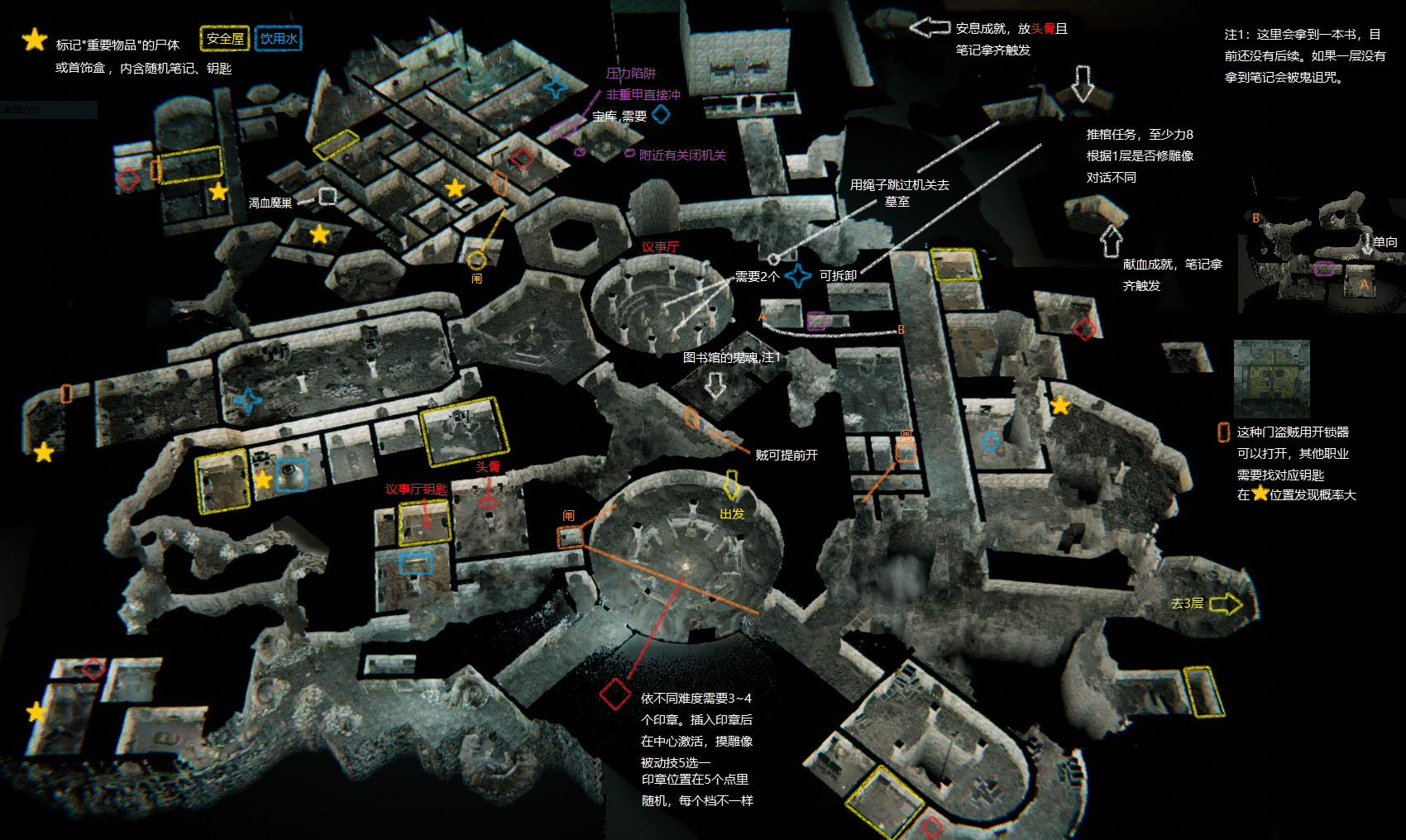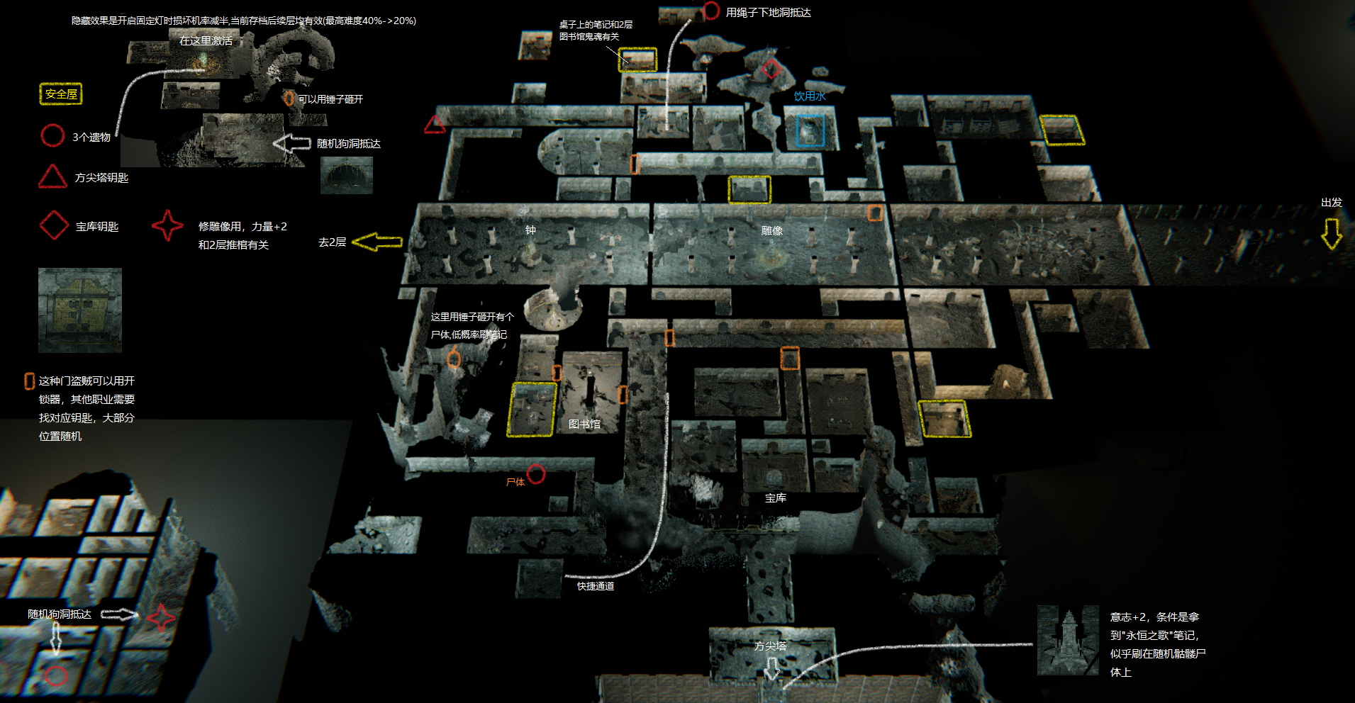 本層重要資訊整理如下:安全屋(黃色方框)提供存檔與休息;飲水點(藍色方框)可恢復狀態;方尖塔鑰匙(紅色三角形)與寶庫鑰匙(紅色菱形)位置隨機分布,盜賊職業可用開鎖工具開啟橙色標記的門省去找鑰匙的麻煩。另有一個隱藏的狗洞可供低姿態移動繞路。此外,地圖中的雕像可修繕以獲得力量+2 增益,同時影響二層推棺任務的觸發條件。