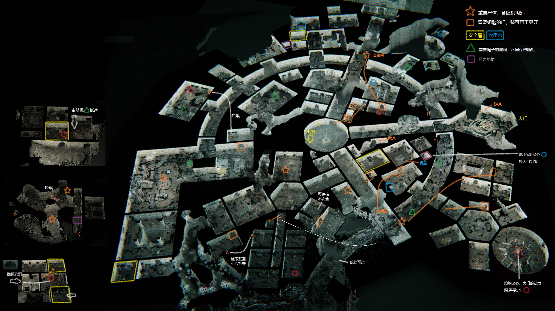 第三層是目前 Early Access 階段最深的地下城層數,地圖規模更大、機關更複雜,重要尸體(含隨機鑰匙)以星形標記標注。本層需要收集 5 個紅色印記才能點燃熔爐之心作為大門動力源,而大門鑰匙可透過地下室用 2 個藍色物件換取。