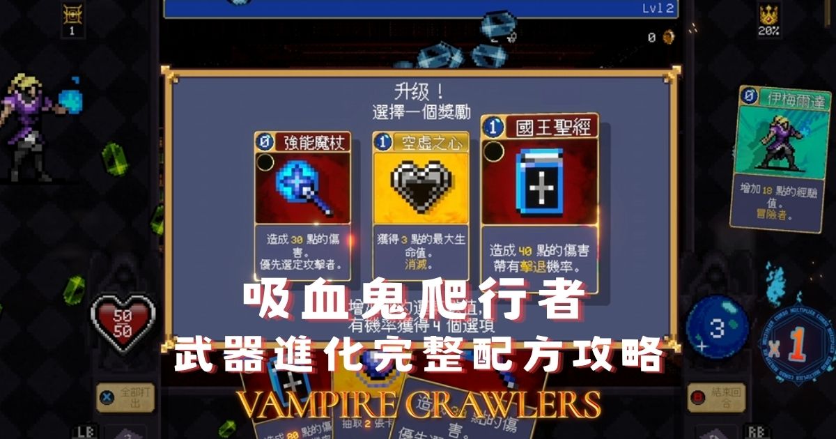 在《Vampire Crawlers》中,武器進化是強化牌組的核心機制。將特定的基礎卡(Base Card)與對應的物品卡(Item Card)結合,即可合成威力遠超基本型態的進化武器,傷害輸出大幅提升。本文將整理遊戲中所有已知的武器進化配方,並附上取得進化寶石的實用技巧,讓你從一開局就掌握最佳策略。